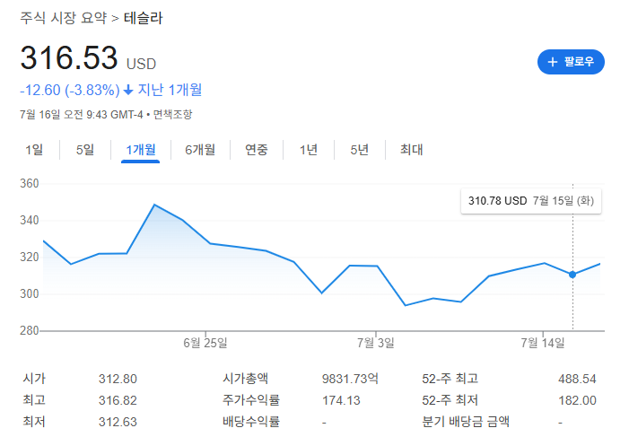 2025년 7월 15일 기준 테슬라 주가는 313.58달러에 마감했습니다. 최근 단기 상승세가 뚜렷하게 나타났는데요, 6일 연속 상승과 28% 급등 이후 현재는 강보합 흐름을 보이고 있습니다.